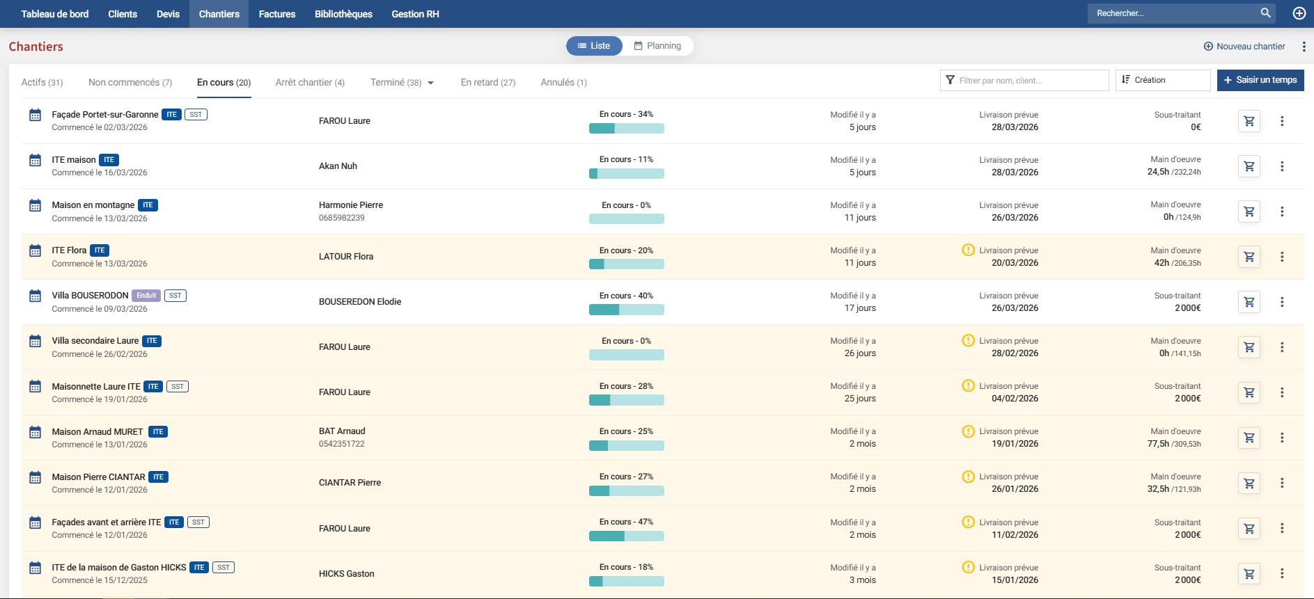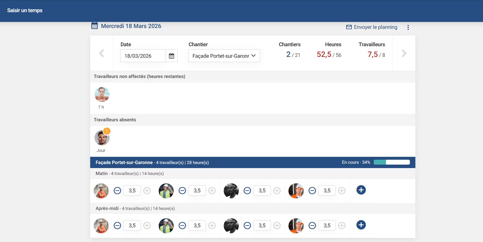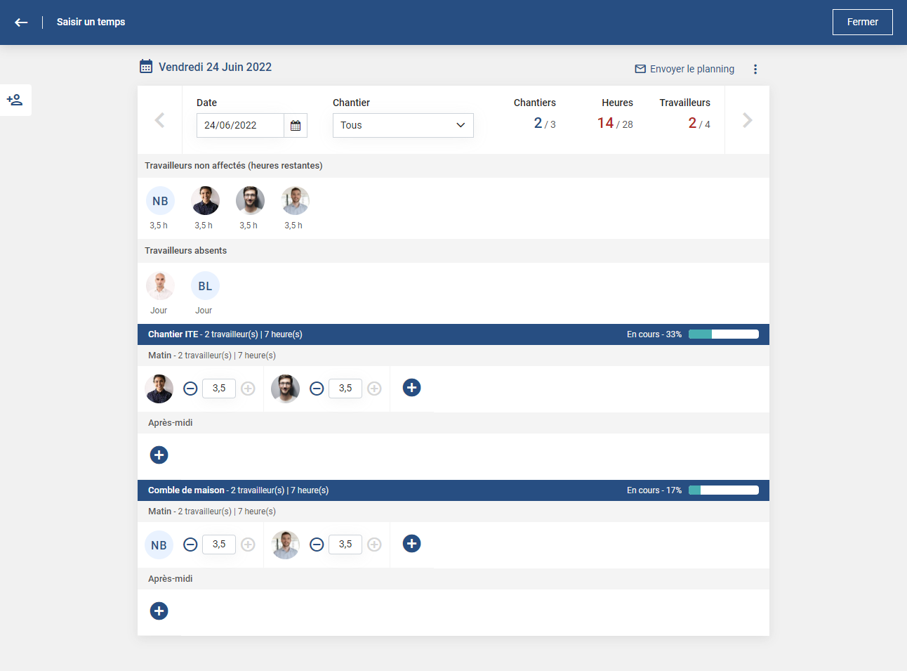 Jour par jour, vous pouvez gérer les présences sur chantier, le module de gestion de chantiers vous permet de :