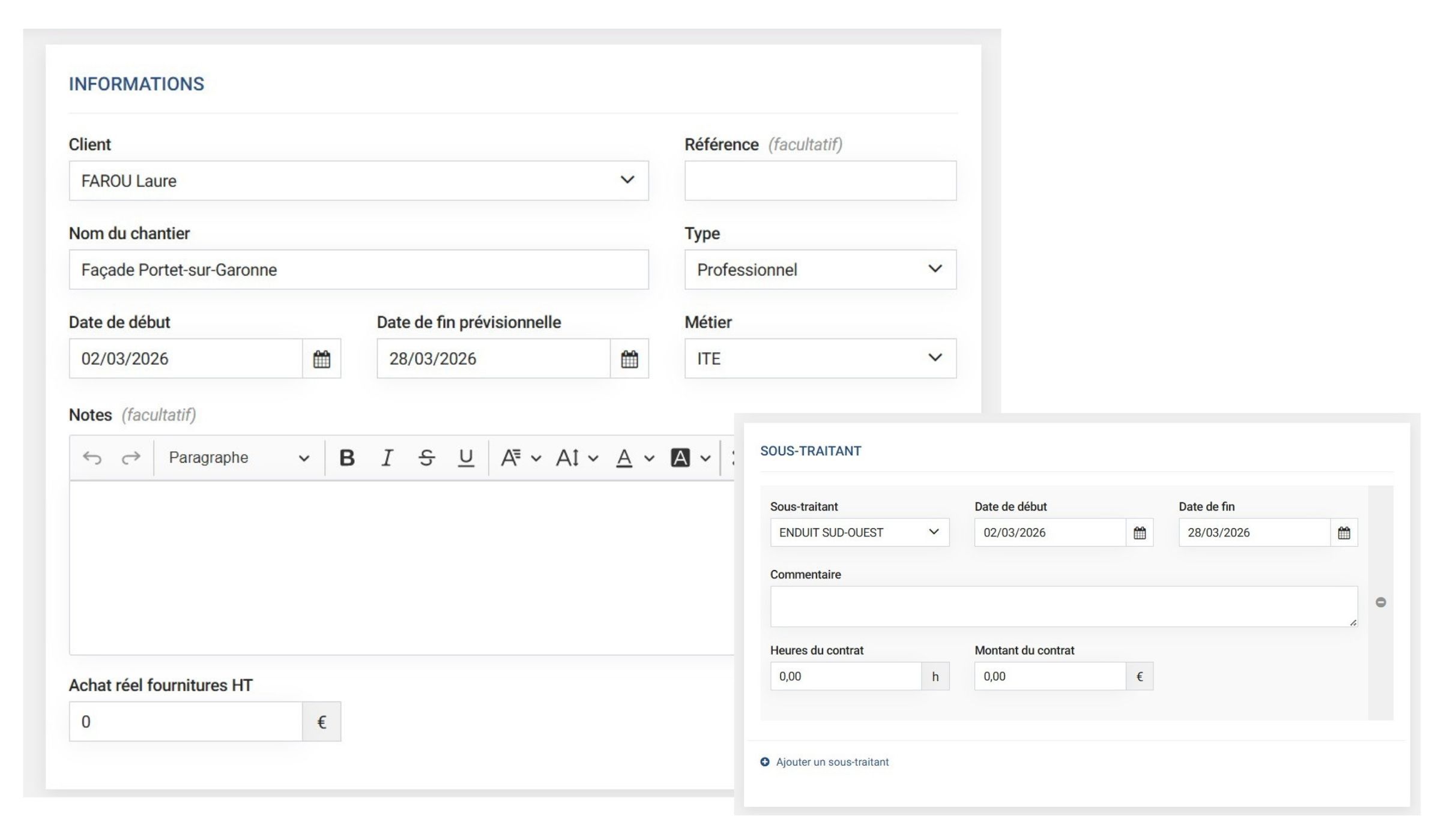 Nommez votre chantier, vos achats de fournitures et gérez votre sous-traitance