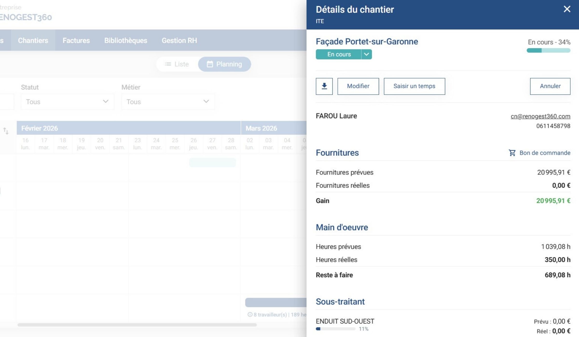 À tout moment, consultez les fournitures, la main d’oeuvre nécessaire, les devis liés à ce chantier, vos marges et l’historique du chantier.