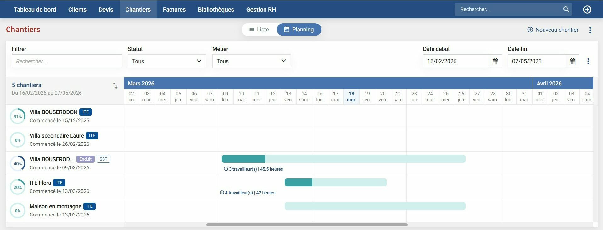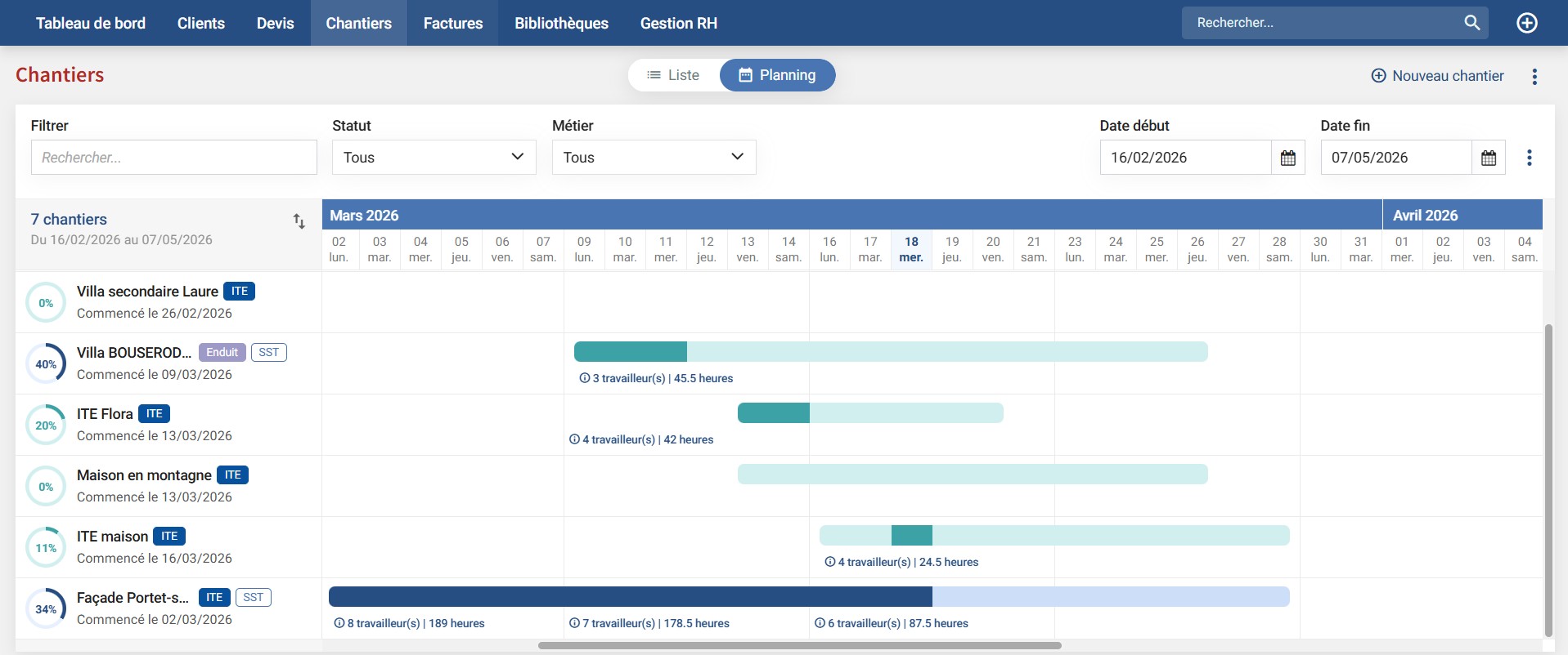 Suivez l’état de vos chantiers via un planning GANTT actualisé en temps réel en fonction des absences et des attributions sur chantier.