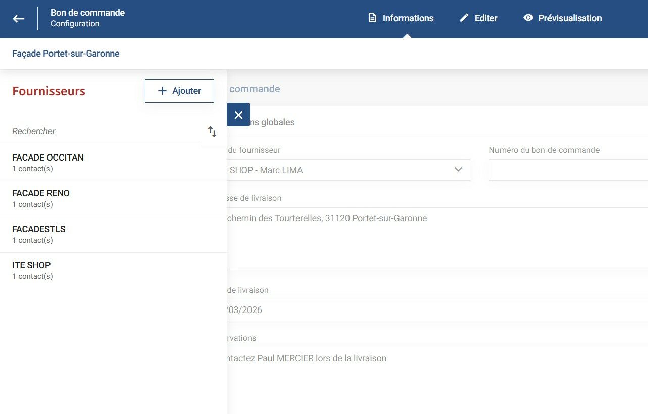 Ajoutez des fournisseurs pour envoyer rapidement votre bon de commande à vos contacts.