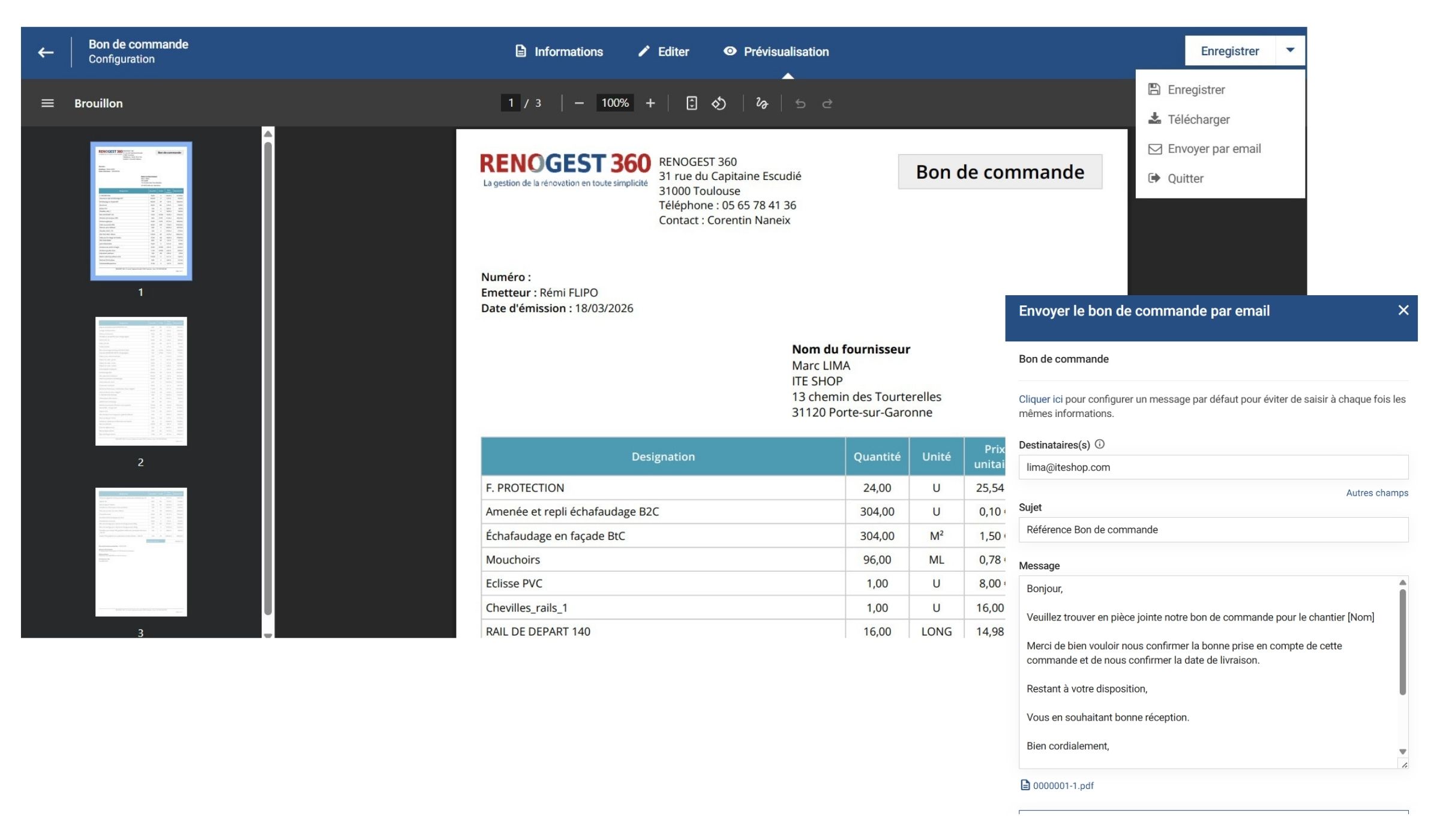 Maintenant que votre bon de commande est prêt, transmettez-le au fournisseur de votre choix rapidement avec la fonctionnalité d’envoi par mail.